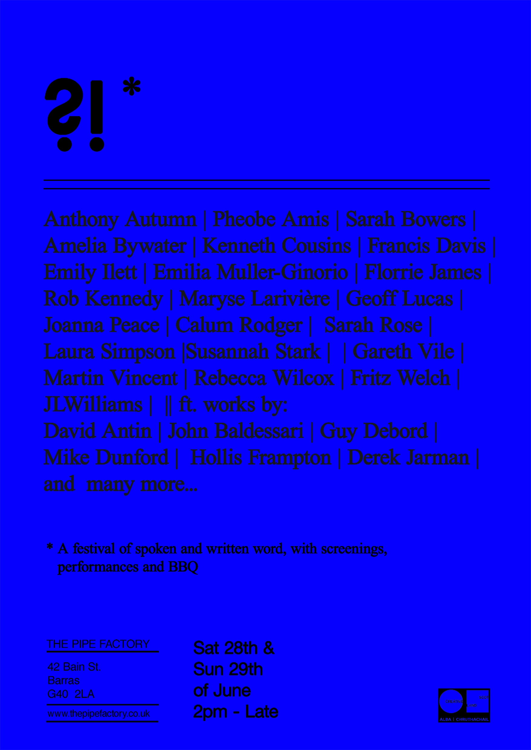 I’m super excited to be taking part in the ?! Festival at The Pipe Factory in Glasgow this weekend. I’ll be performing at 2.30pm on Sunday, but there is plenty to experience throughout the weekend including spoken and written word, screenings and BBQ. Sweet! Find out more here and here.